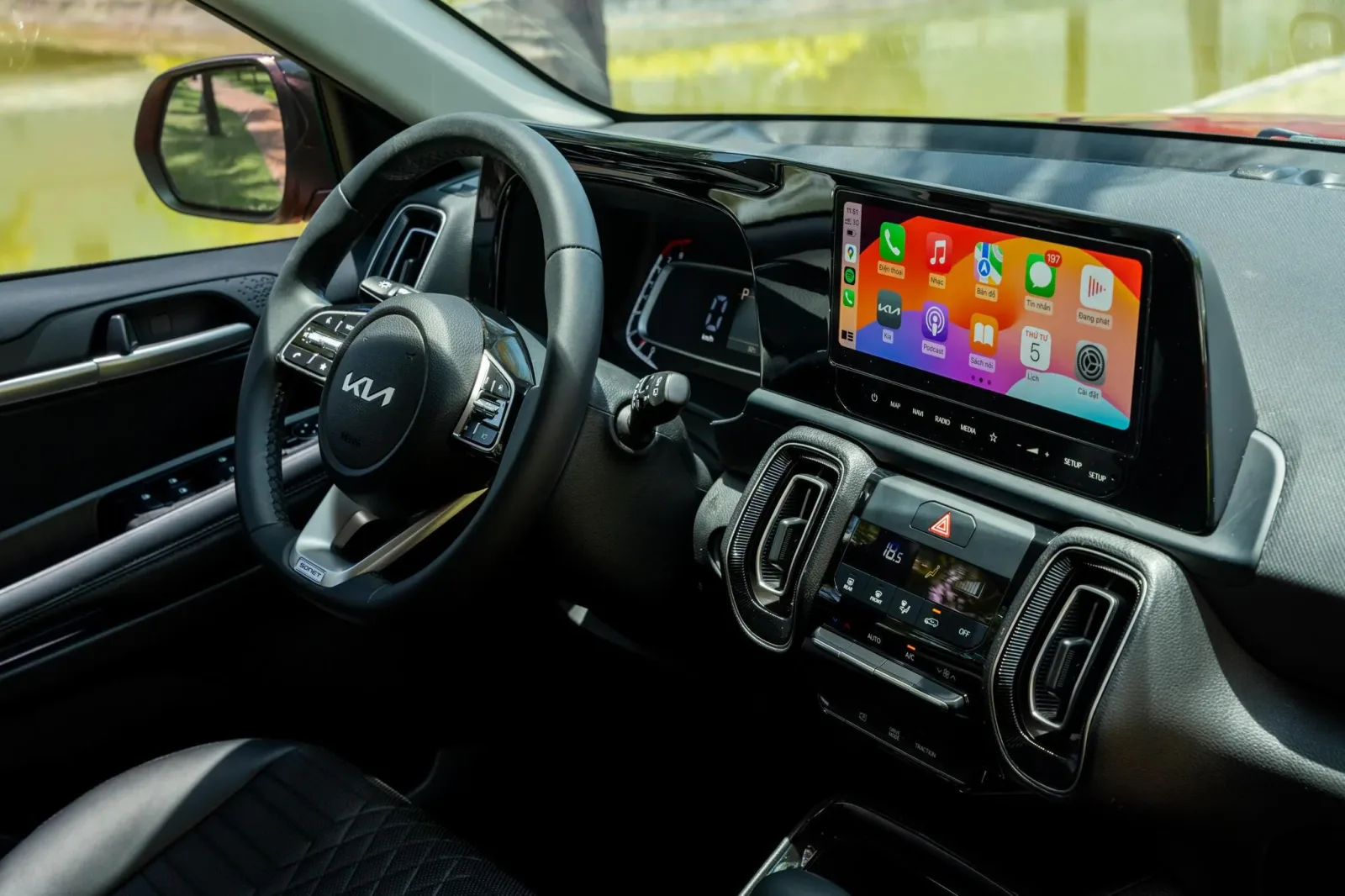 Vô lăng của Kia Sonet có thiết kế dạng 3 chấu, được bọc da. Đặc biệt, vô lăng này mang thiết kế thể thao kiểu đáy bằng, tạo cảm giác mạnh mẽ và hiện đại cho người lái.