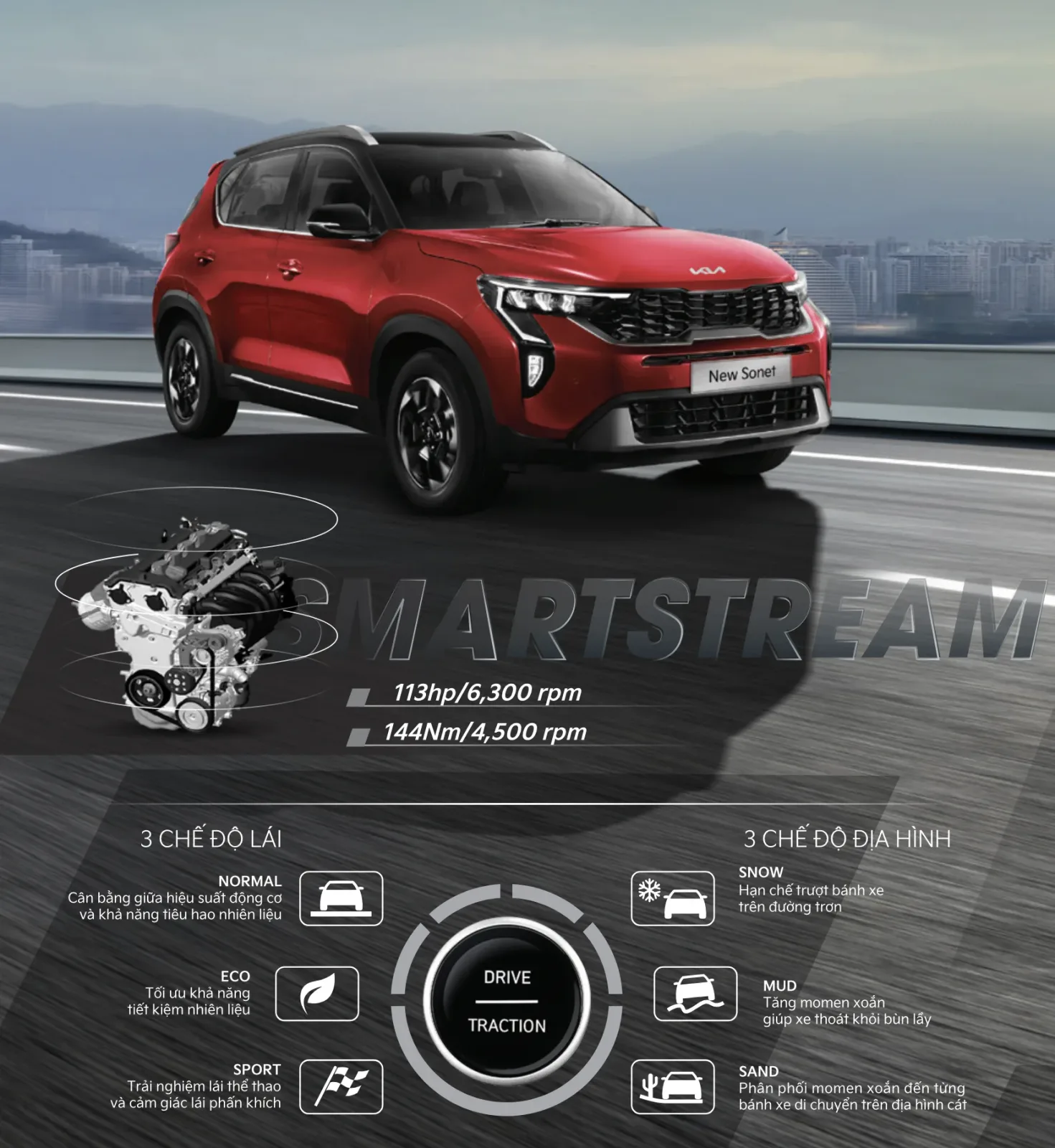 Kia New Sonet phân phối tại Việt Nam được trang bị động cơ SmartStream 1.5G tương tự như New Seltos ra mắt trước đó. Động cơ này sản sinh công suất tối đa 113 mã lực và 144 Nm mô-men xoắn, giúp Sonet có khả năng vận hành mạnh mẽ vượt trội.