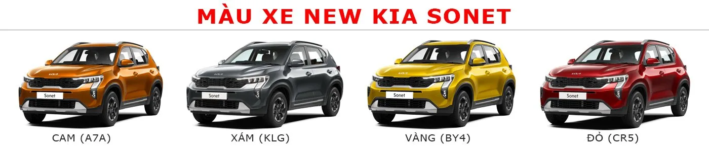 KIA Sonet được bán ta tại thị trường Việt Nam với 8 màu sắc khác nhau: Đỏ(CR5), Đen(FSB), Vàng(B4Y), Cam(A7A), Xám(KLG), Xanh(M4B), Trắng(GWP), Vàngcát(QYG).